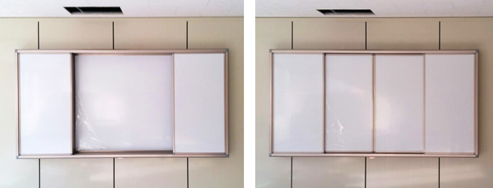 미닫이칠판은 자석화이트보드의 본칠판 + 고정 2개, 슬라이딩 2개의 보조칠판으로 구성되었습니다.