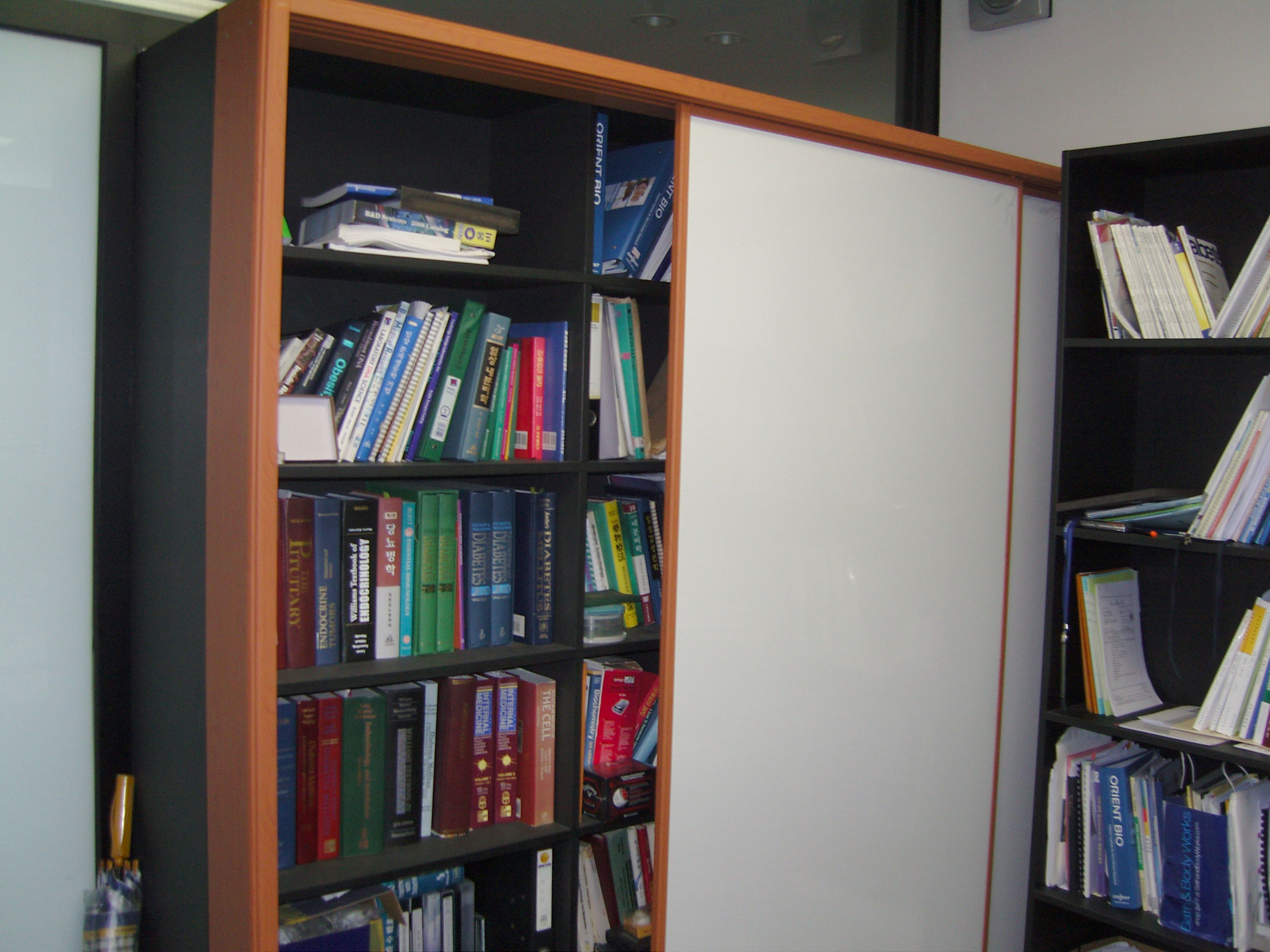 미닫이칠판을 책장의 앞면에 설치하여 문이 없던 책장을 마치 북박이 책장처럼 만드셨네요 ^^