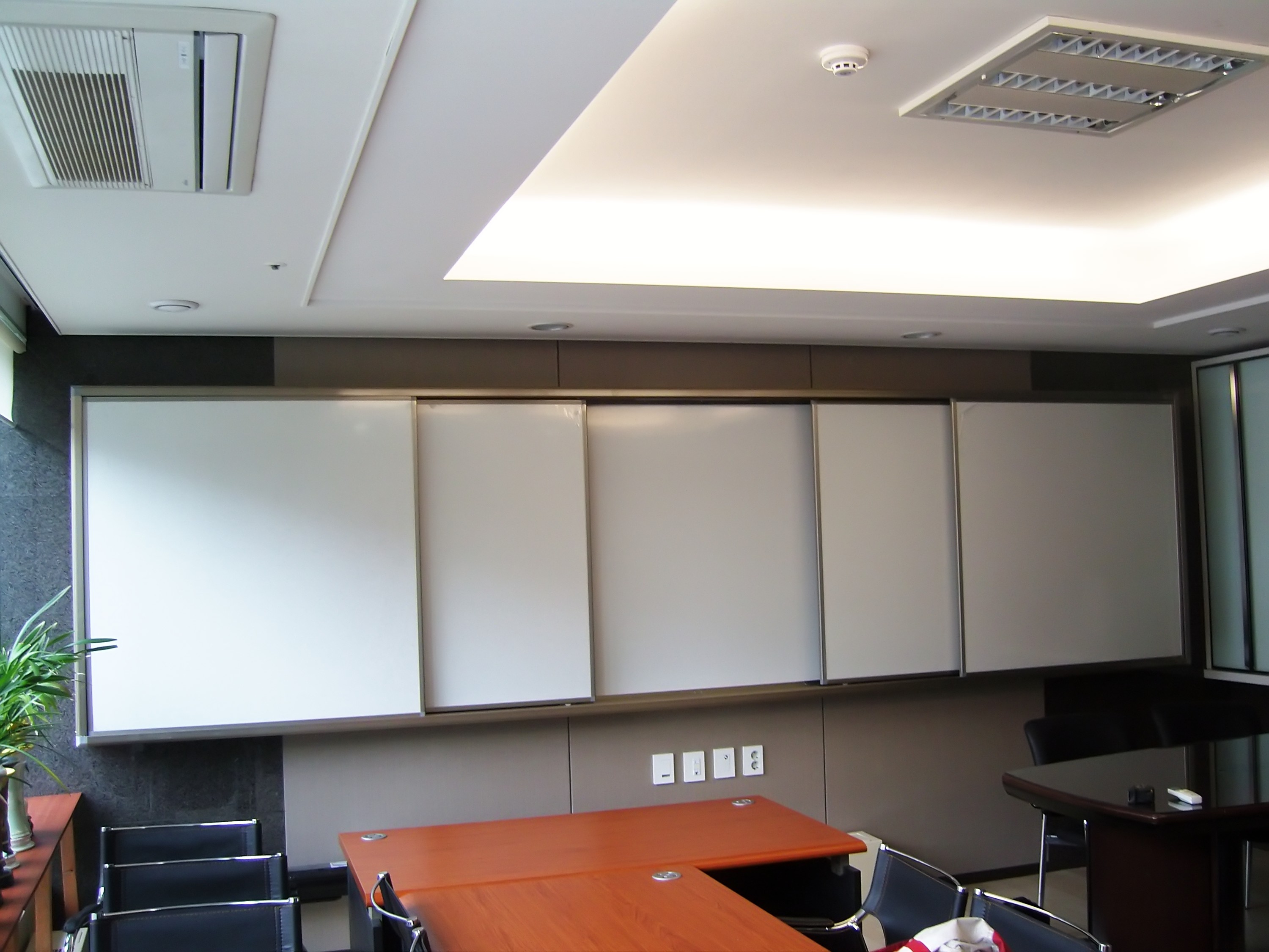 서울 서초구 소재 에이피에스 에 설치해드린 미닫이 칠판 128.5*480 제품의 모습입니다