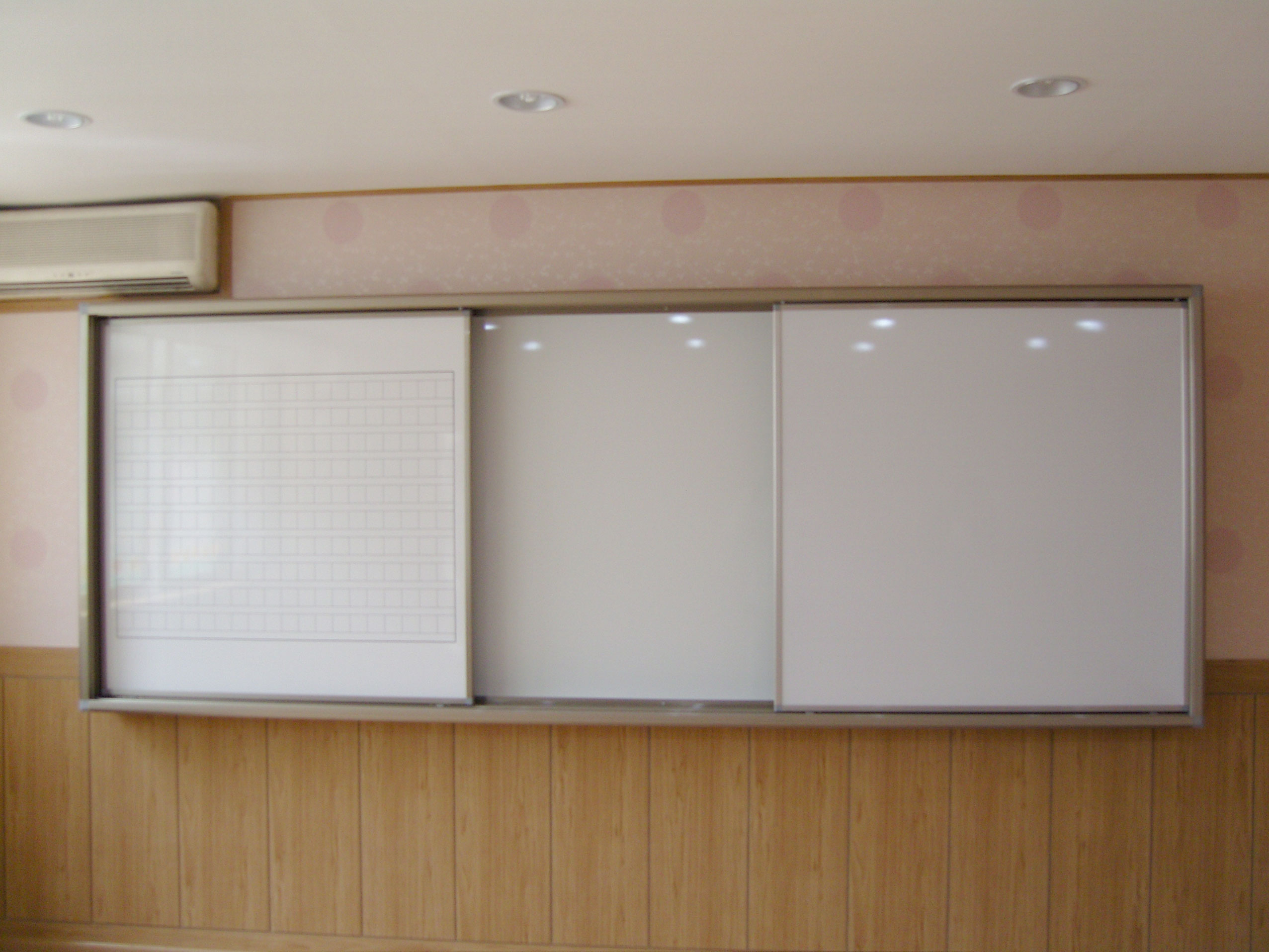 * 미닫이구성 : 본칠판 fullsize, 보조칠판(백스틸 슬라이드 1개 + 원고지 슬라이드 1개)