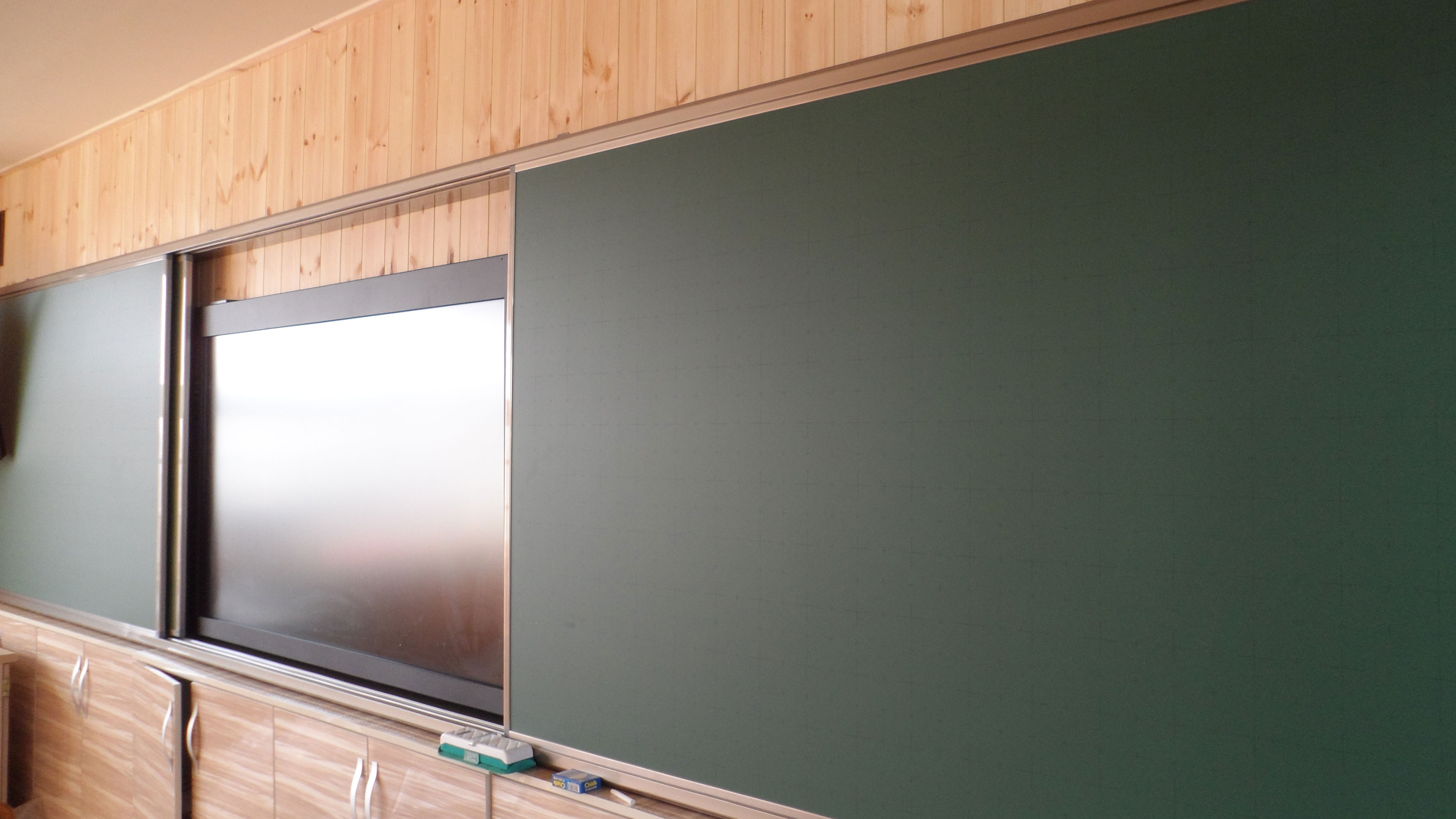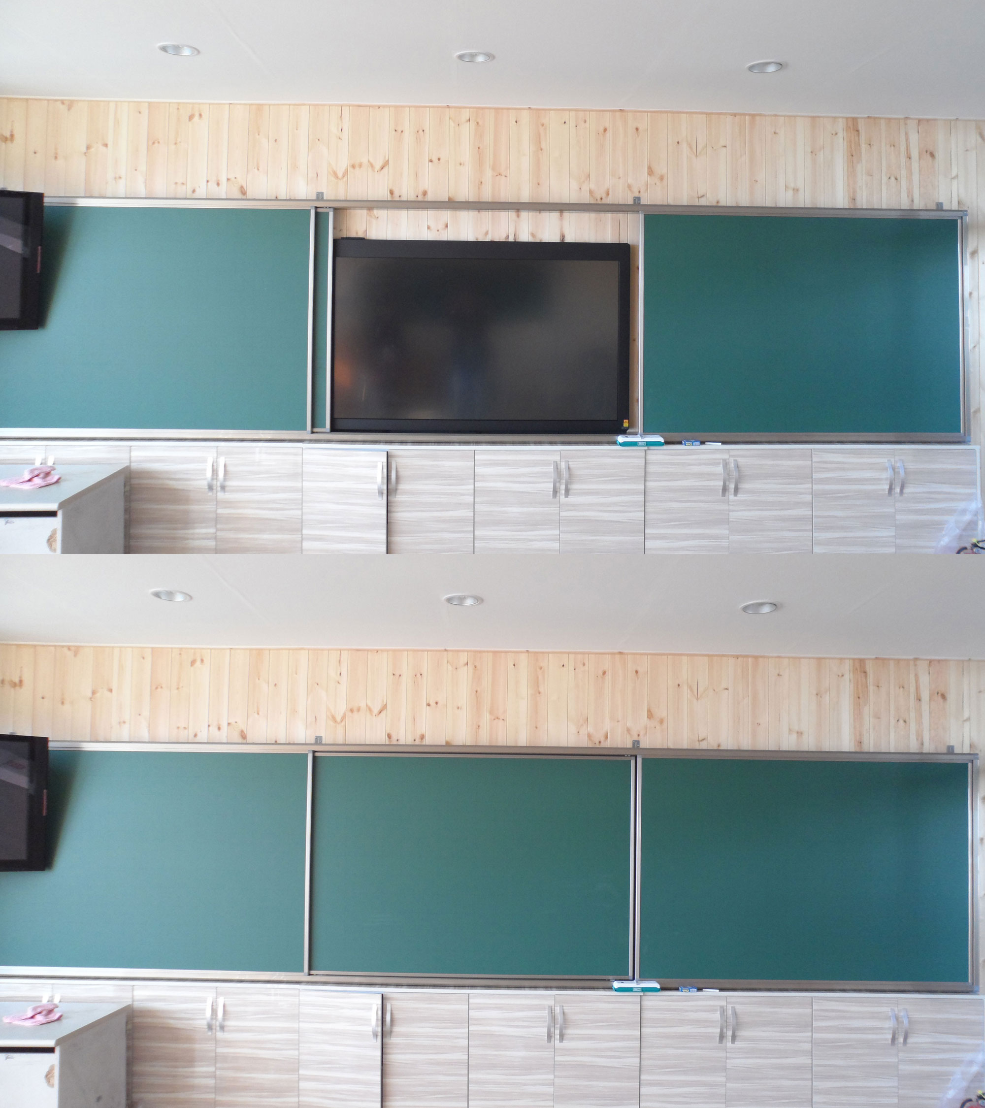 경남 밀양시 소재 밀양중학교에 설치해드린 미닫이 칠판 128.5*540 제품의 모습입니다.