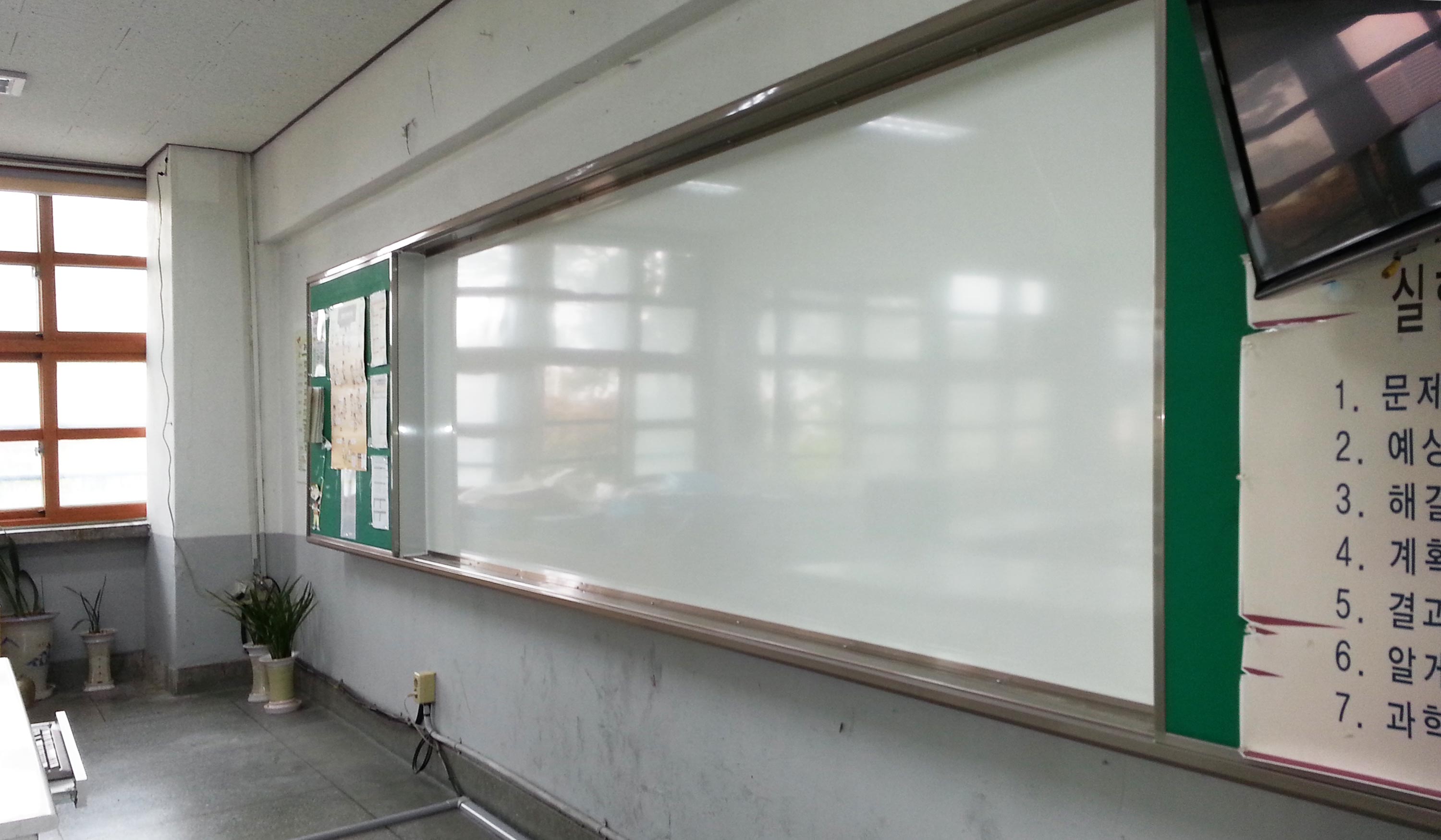 미닫이 곡면칠판의 테두리는 그대로 두고 칠판내부를 법랑 속판으로 판교체(평면) 해드린 작업의 모습입니다.