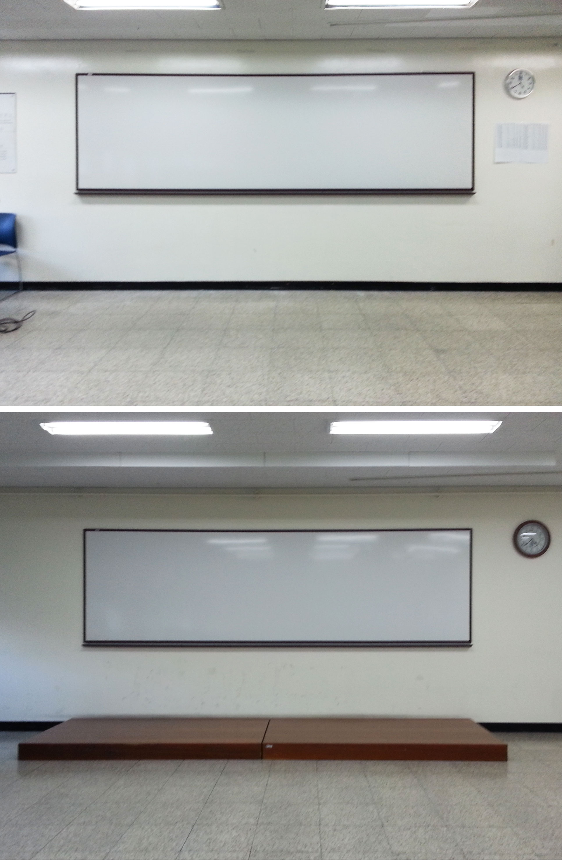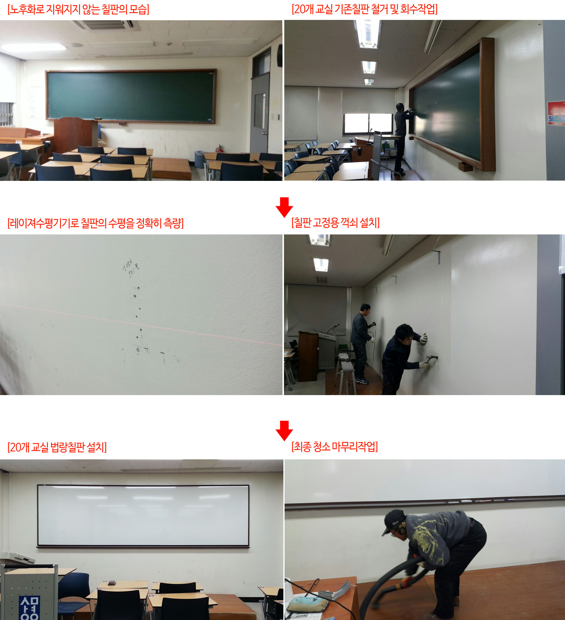 총20개 강의실의 기존칠판 철거 및 법랑칠판 설치, 최종 청소마무리까지의 작업을 사진으로 현장 스케치합니다.