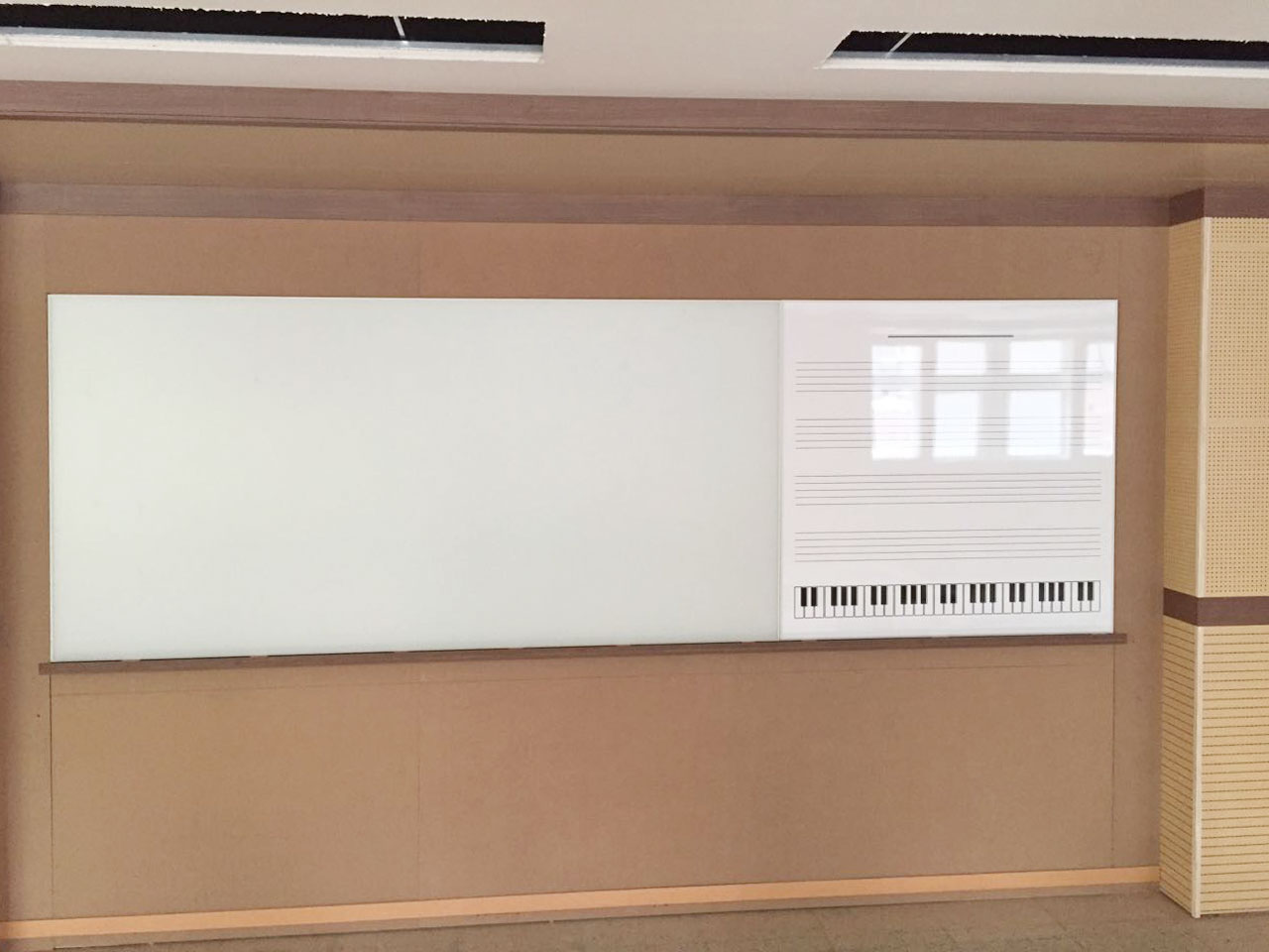 좌측으로 난반사유리칠판, 우측으로 도안(오선지) 칠판을 나란히 붙여 연결설치해 드렸습니다.
