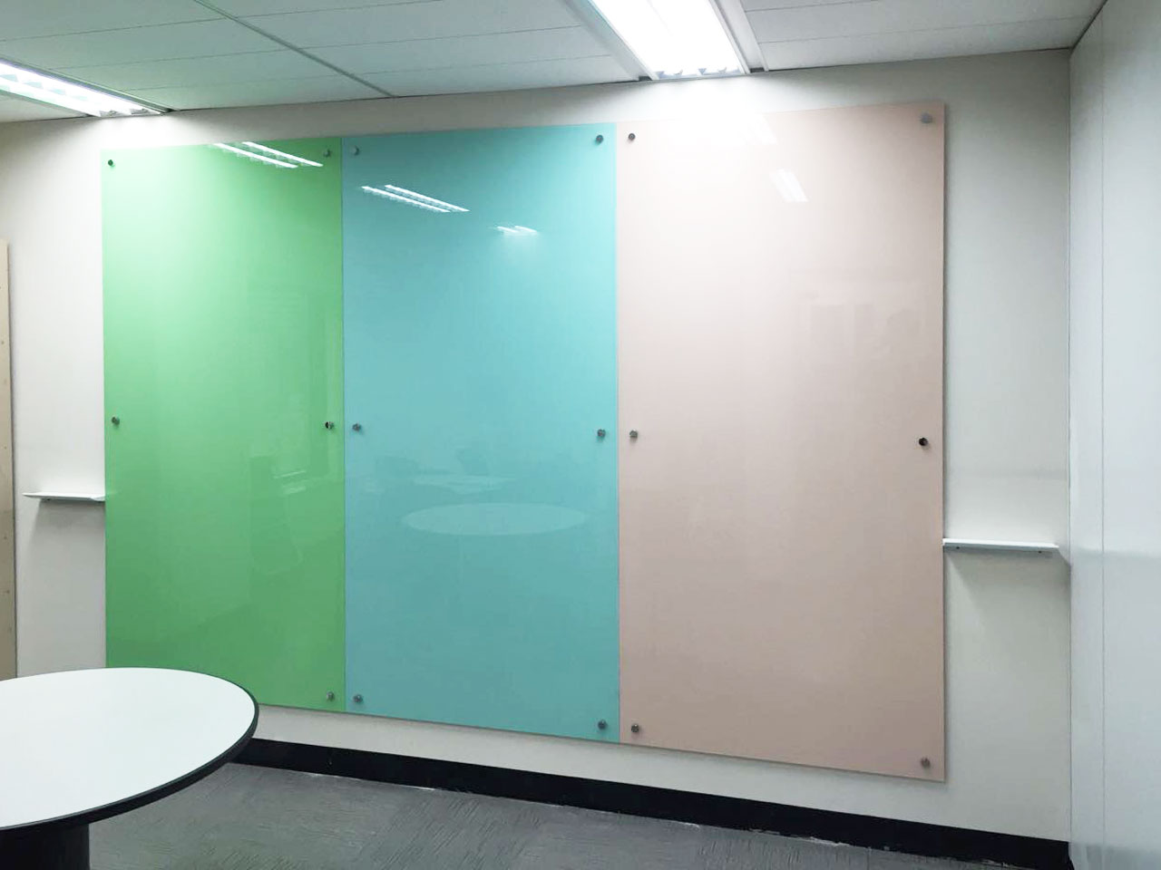 칼라유리는 각각 연그린/연하늘/백장미 색상으로 100*210 3장을 나란히 연결설치 해 드렸습니다.